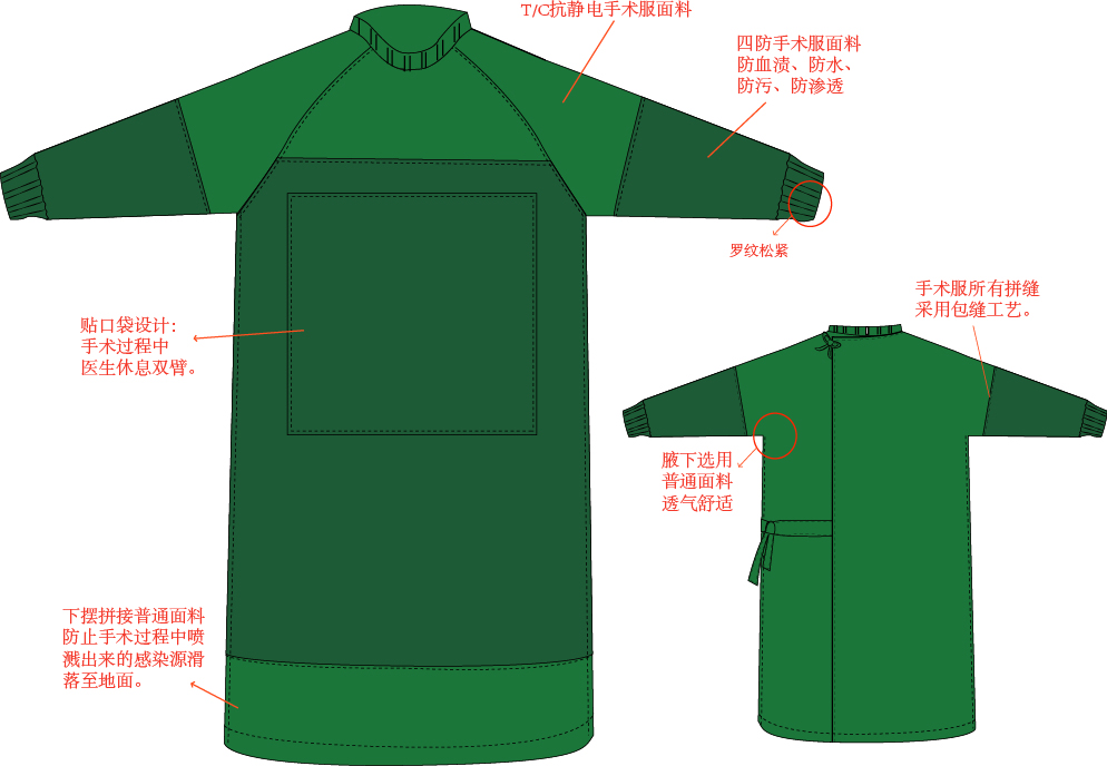 普通棉布手術(shù)衣 目前的刷手服基本保持著自身獨(dú)有的簡(jiǎn)潔樣式。短袖V領(lǐng)上衣,寬松易解褲子,易洗耐磨,透氣性好,手感舒適。在手術(shù)的時(shí)做手術(shù)的醫(yī)生和護(hù)士還會(huì)穿上一件手術(shù)衣,這些衣服大多純棉質(zhì)地,不慎沾染上血跡或液體,感覺(jué)有兩個(gè):沉甸甸、濕漉漉。沉甸甸自然是吸水性好,濕漉漉則是通透性好。 手術(shù)衣大多在做現(xiàn)在的腔鏡手術(shù)時(shí),由于看電腦屏幕的原因,醫(yī)生會(huì)側(cè)著身體,沒(méi)有包圍好的背部還極易污染手術(shù)臺(tái),畢竟,每一位進(jìn)手術(shù)室的醫(yī)生護(hù)士門,大多都是貼身內(nèi)衣褲外面,穿著刷手服。有時(shí)怕腳冷,還會(huì)穿雙襪子,除此之外,身無(wú)長(zhǎng)物呀。手術(shù)衣、刷手衣被浸濕了倒不要緊,要是貼身內(nèi)衣褲也被浸濕了,心理還是會(huì)有些障礙。 對(duì)于刷手服和手術(shù)衣,長(zhǎng)久以來(lái)的都是棉布做的,而隨著科技的發(fā)展,對(duì)手術(shù)患者以及醫(yī)護(hù)人員的保護(hù),醫(yī)院感染標(biāo)準(zhǔn)的不斷完善,更高級(jí)的材料做的手術(shù)衣服浮出水面~